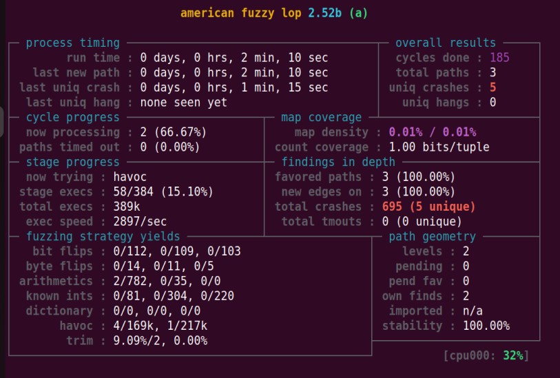 afl-whatsup工具可以查看每个fuzzer的运行状态和总体运行概况,加上-s选项只显示概况,其中的数据都是所有fuzzer的总和 afl-gotcpu工具可以查看每个核心使用状态
