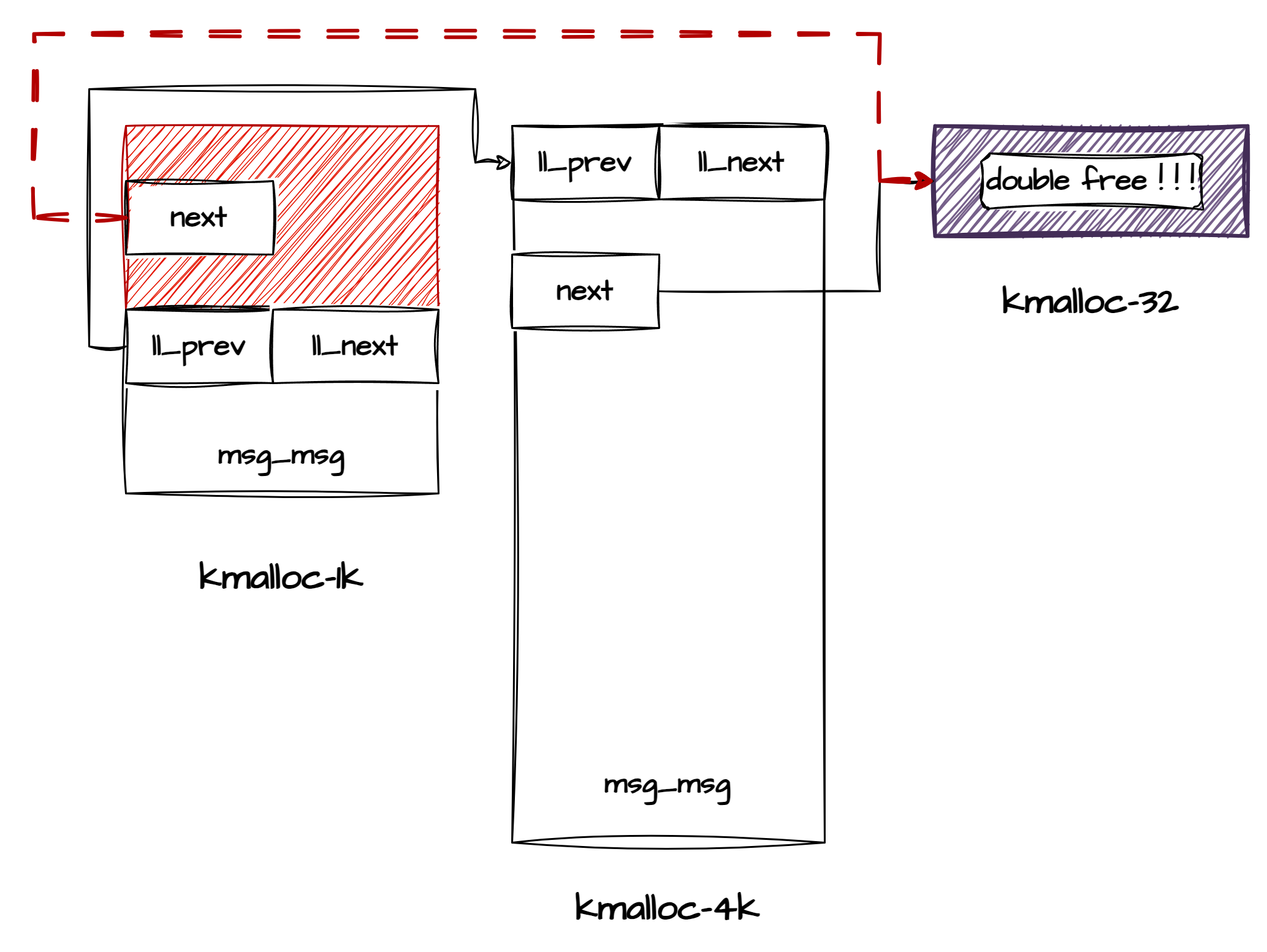 之后通过 msg_msg 构造 double free 如下所示红色为利用 UAF 控制的 msg 结构体,下方有一个紧挨着的msg,同时由于使用相同 qid 发送了第二段长度为0x1018-0x30的消息,第二段消息会使用ll_prev链接;第二段消息多出来0x18内容会申请到 kmalloc-32 大小 object ,由开头8字节 next 指针和0x18字节真实内容组成
