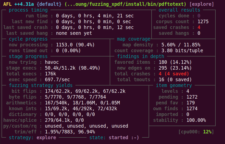 afl-fuzz -i $HOME/fuzzing_xpdf/pdf_examples/ -o $HOME/fuzzing_xpdf/out/ -s 123 -- $HOME/fuzzing_xpdf/install/bin/pdftotext @@ $HOME/fuzzing_xpdf/output