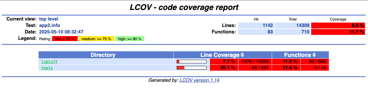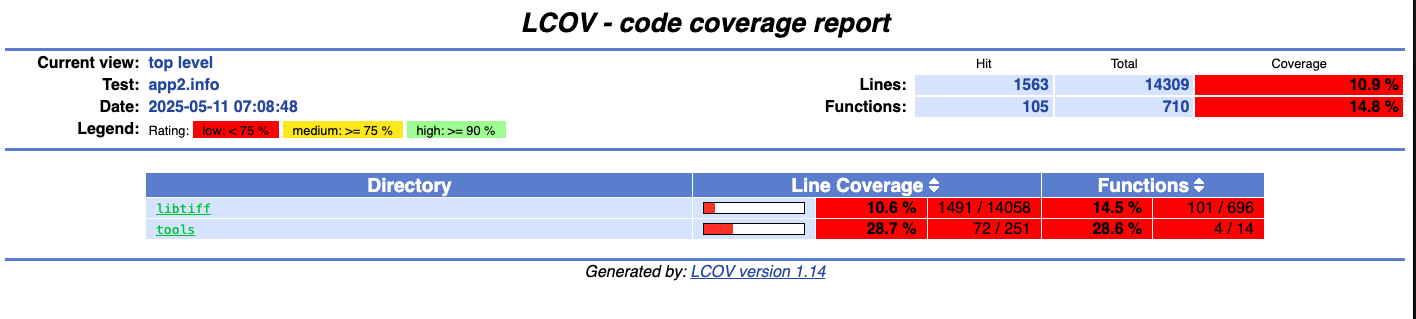 cd $HOME/fuzzing_tiff/tiff-4.0.4/ lcov --zerocounters --directory ./ # 重置以前的计数器 lcov --capture --initial --directory ./ --output-file app.info # 返回"baseline"覆盖数据文件,包含每个检测行的零覆盖率 $HOME/fuzzing_tiff/install/bin/tiffinfo -D -j -c -r -s -w $HOME/fuzzing_tiff/tiff-4.0.4/test/images/palette-1c-1b.tiff lcov --no-checksum --directory ./ --capture --output-file app2.info # 将当前覆盖状态保存到app2.info文件中