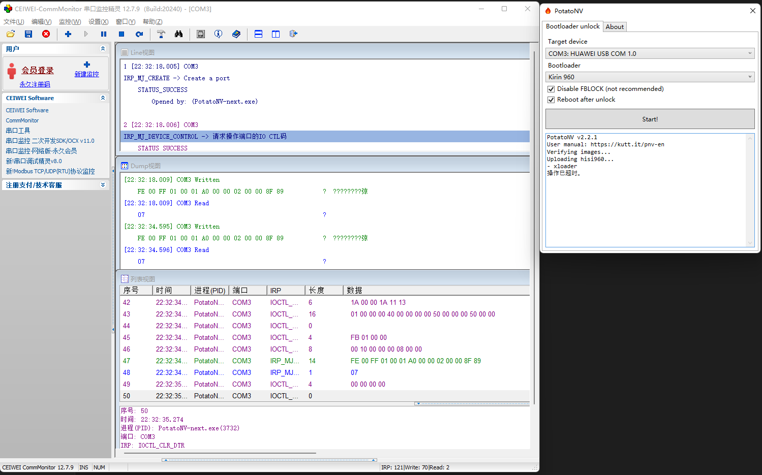 找到一个刷旧版本华为固件的软件 PotatoNV CommMonitor 串口监控精灵,监控串口流量