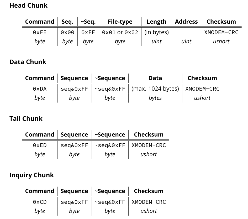 Head chunk:下载镜像地址和大小 Data chunk:要加载的实际镜像片段,每次最大1024字节增量下载,并附带一个序列计数器 Tail chunk:终止传输,并进入镜像验签阶段 Inquiry chunk:向 bootloader 请求状态值(读取固定地址0x21e044字节内容)