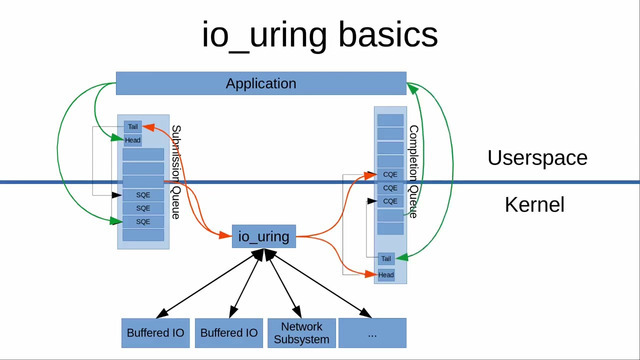 每个io_uring实例都有两个环形队列(ring),在内核和应用程序之间共享