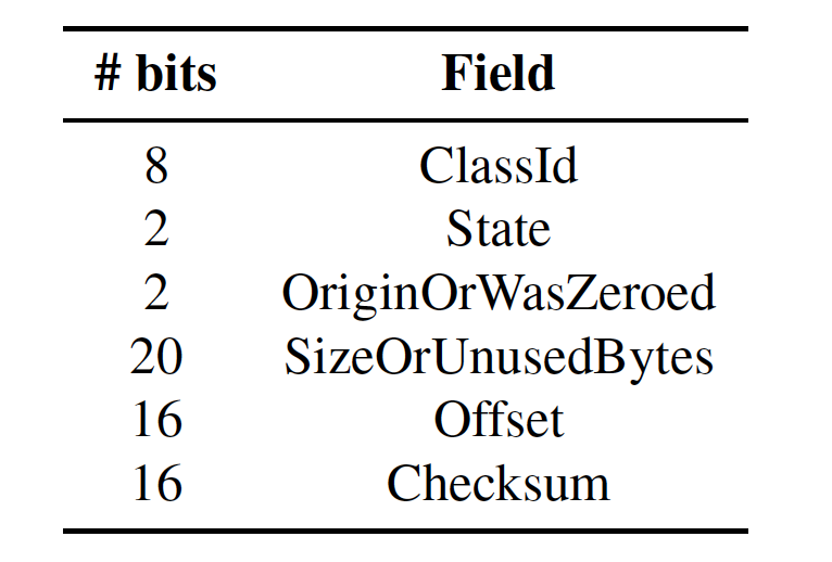 The fields and corresponding sizes in the Scudo chunk header. The OriginOrWasZeroed field indicates the origin of the chunk, e.g., malloc or new. The SizeOrUnusedBytes field indicates the exact chunk size. Offset is filled with zeros.