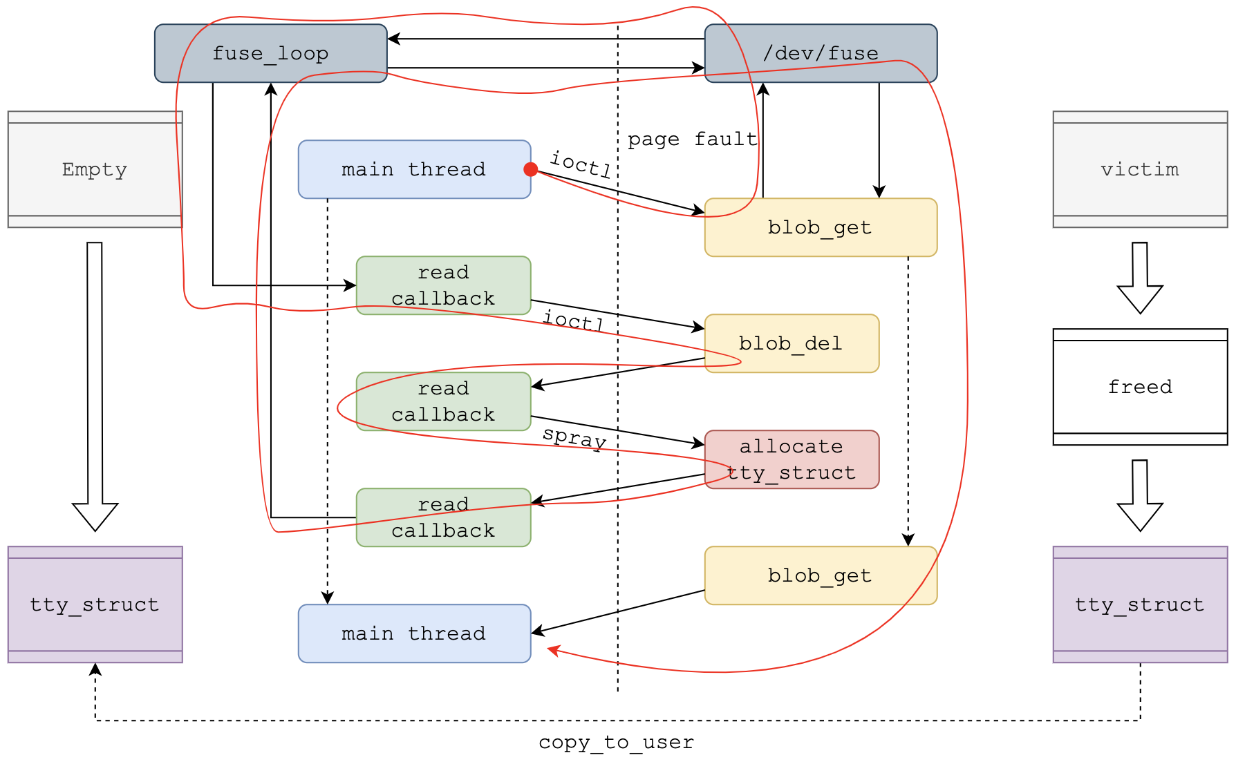 UAF read和UAF write触发的都是FUSE read_callback,不需要write_callback。因为fuse callback发生在文件访问过程中,并不是内存页的访问过程。从引发缺页异常到FUSE callback处理,对文件来说,都是首先被读到内存页中
