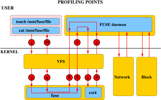 此时如果在该目录中有相关操作时,请求会经过VFS到fuse的内核模块,fuse内核模块根据请求类型,调用用户态应用注册的函数,然后将处理结果通过VFS返回给系统调用(步骤3)。参考